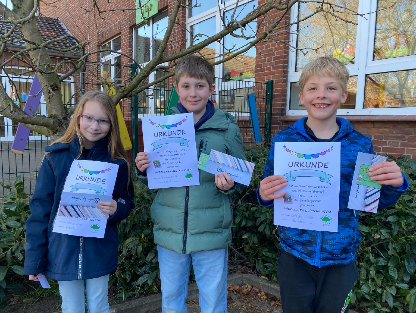Am Freitag versammelten sich dann alle Kinder am Ende der großen Pause auf dem Schulhof zur Siegerehrung des Lesewettbewerbs: Leon gewann in der Jahrgangsstufe 2, Paul war der Sieger in der 3. Klasse und Jamie belegte den 1. Platz in der Jahrgangsstufe 4. Zusätzlich zu einer Urkunde wurden die SiegerInnen mit einem Buchgutschein belohnt, den der Förderverein finanzierte. Alle weiteren FinalistInnen erhielten einen Hausaufgabengutschein.