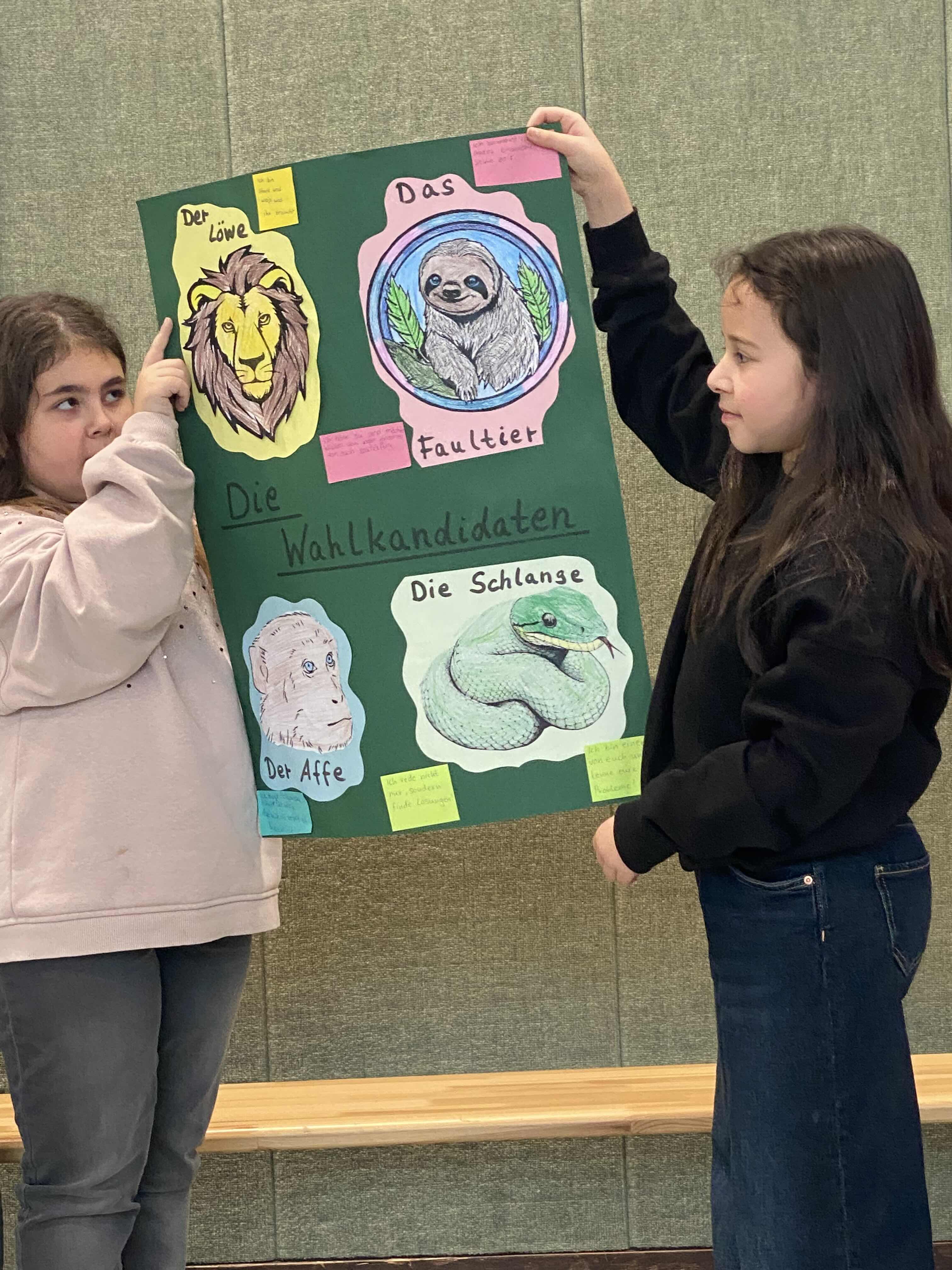 In der Woche vom 03.11. bis 07.11.2025 stand unsere Schule ganz im Zeichen der Demokratie. Unter dem Motto "Mitbestimmen, Mitreden, Mitgestalten" erlebten alle SchülerInnen täglich zwei Unterrichtsstunden, was es bedeutet, Verantwortung zu übernehmen und gemeinsam Entscheidungen zu treffen. Alle Klassen beschäftigten sich dabei mit spannenden Fragen: Wie können wir gut miteinander leben? Wie funktioniert Mitbestimmung in der Schule, in der Klasse oder sogar in der Stadt? Wie läuft eine Wahl ab? In den Klassen wurde dazu gelesen, gespielt und diskutiert. Und unsere ViertklässlerInnen interviewten unseren Bürgermeister Peter Horstmann im Ratssaal des historischen Rathaus. Es entstanden Plakate, Wahlplakate, digitale Bücher und Videos.