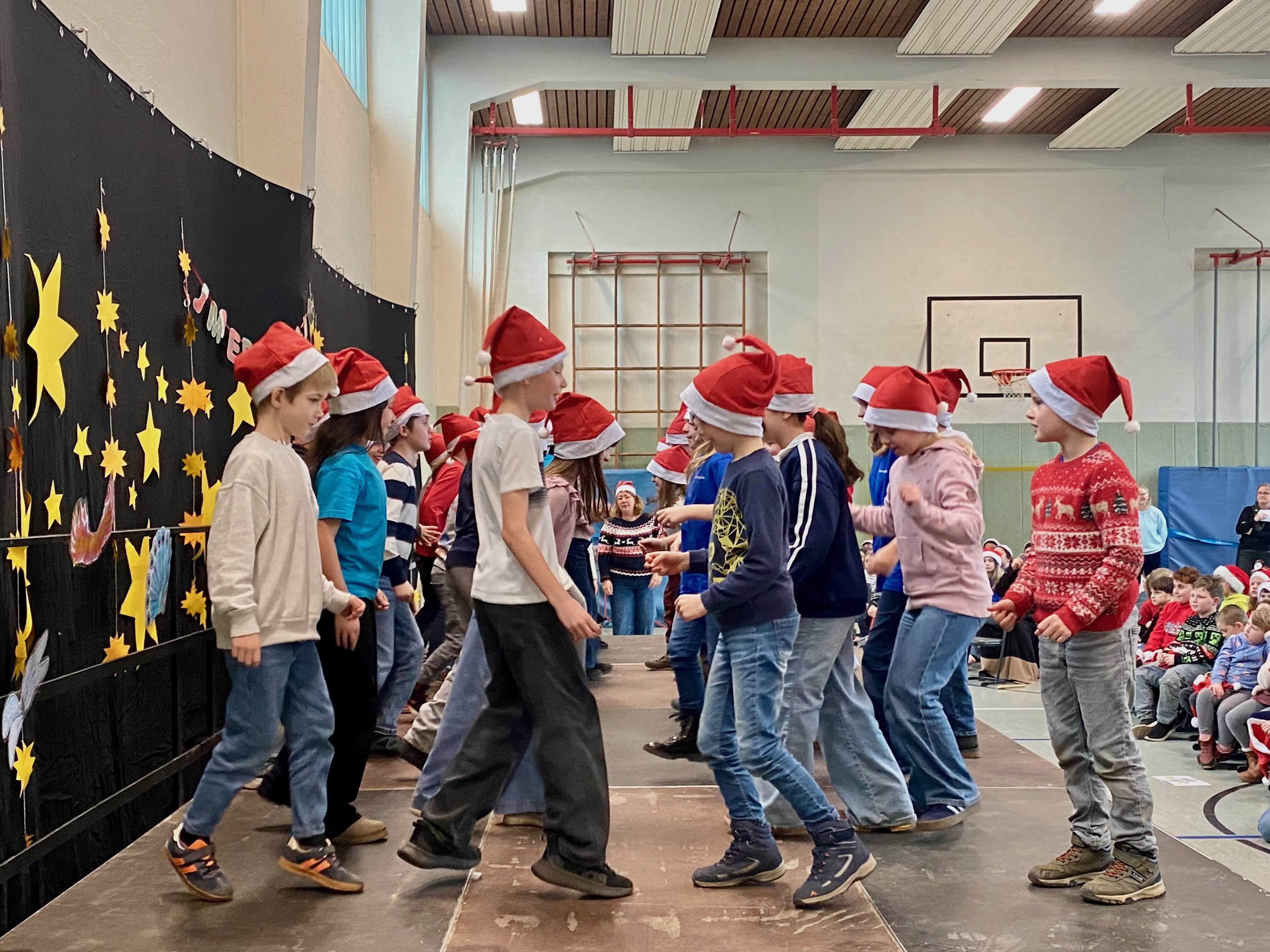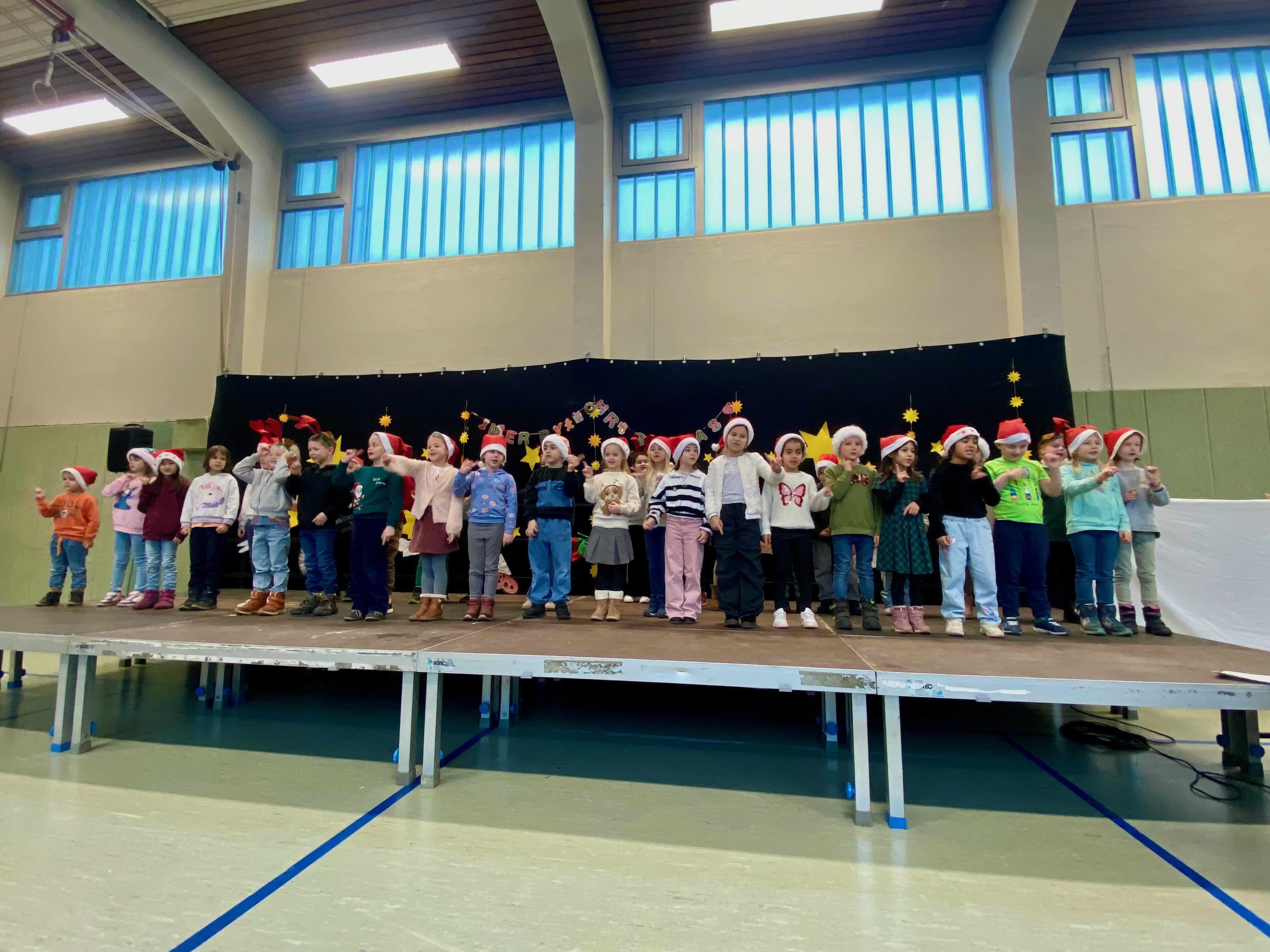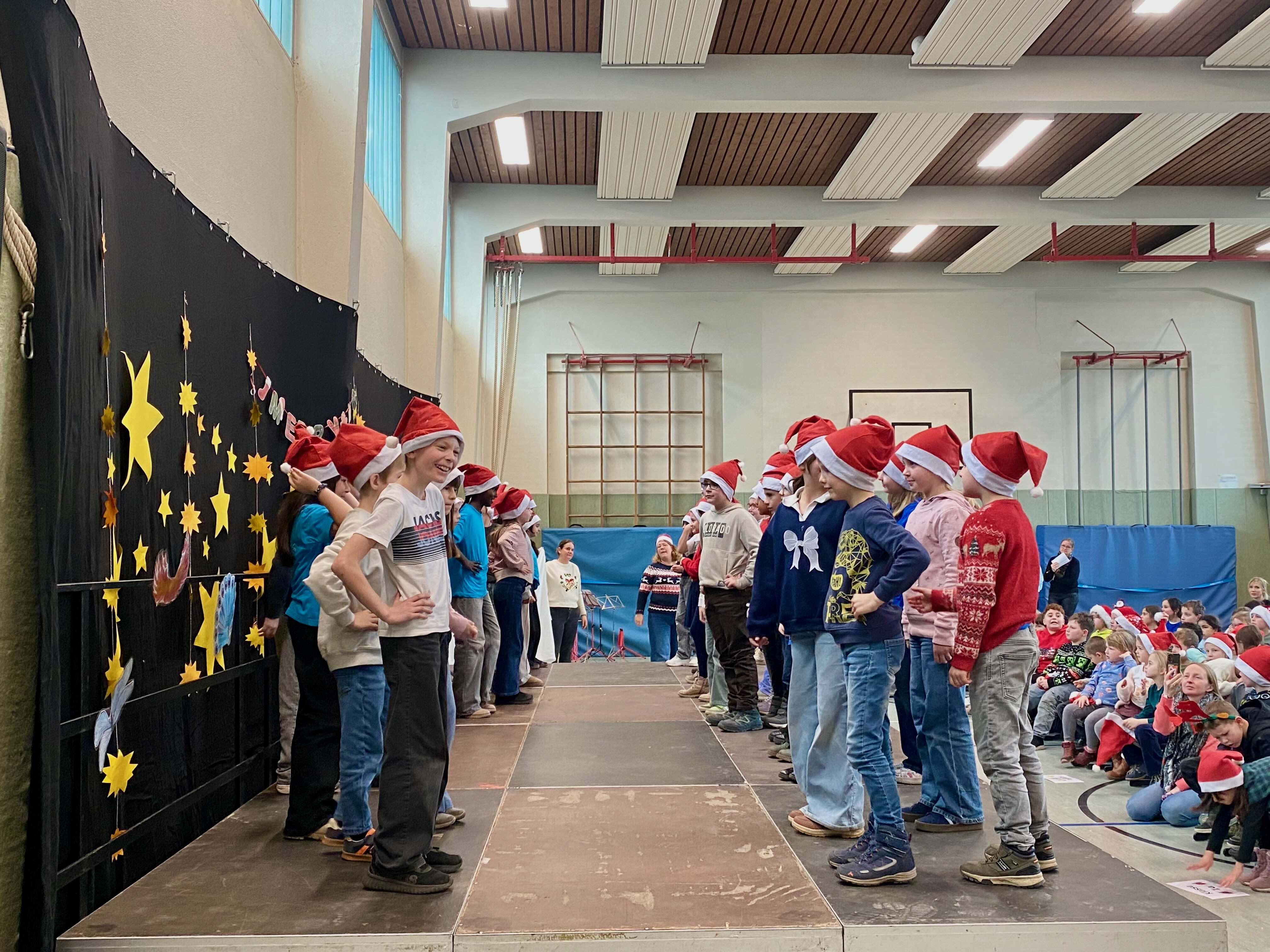 In festlicher Atmosphäre fand unsere diesjährige Weihnachtsfeier in unserer Turnhalle statt. Vor großem Publikum aus allen SchülerInnen, LehrerInnen, Eltern und Großeltern präsentierten die Kinder ein abwechslungsreiches Programm. Jedes Kind hatte mindestens einen Auftritt und durfte zeigen, was es in den letzten Wochen mit viel Engagement vorbereitet hatte.