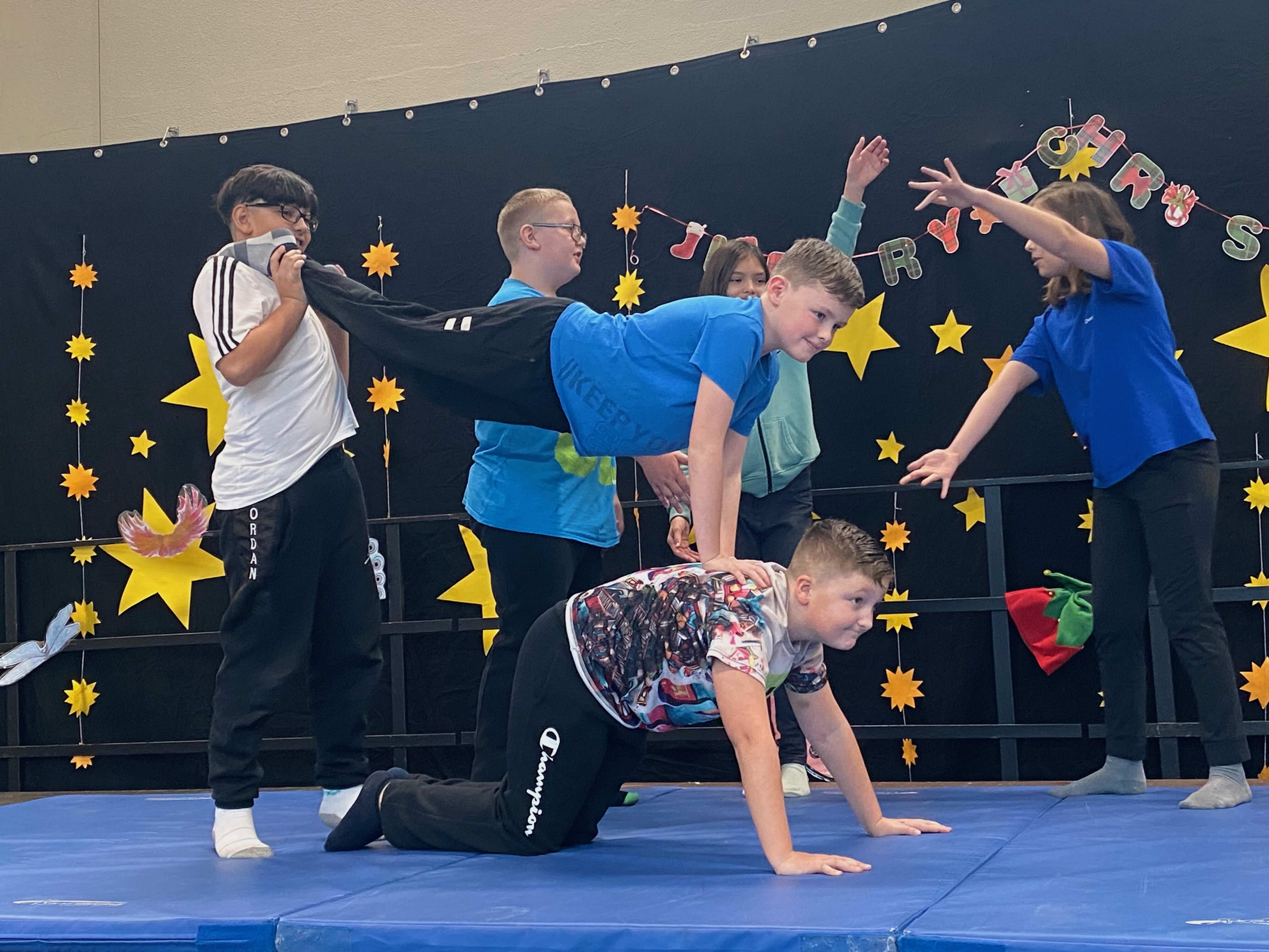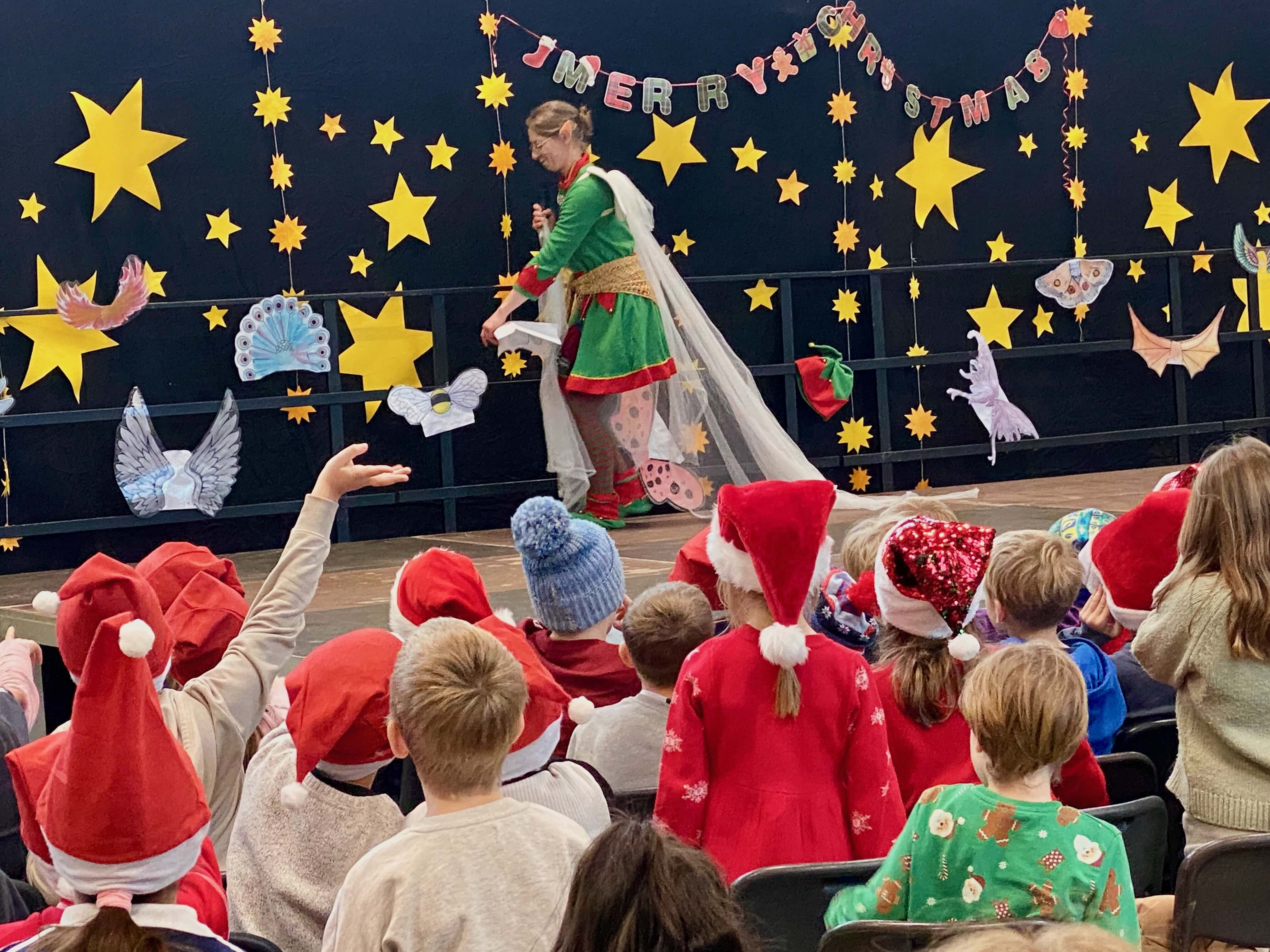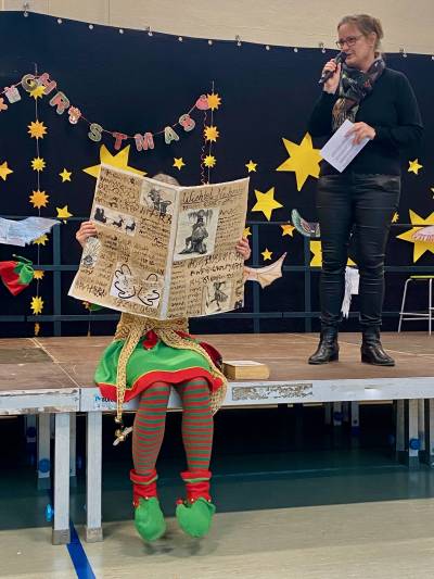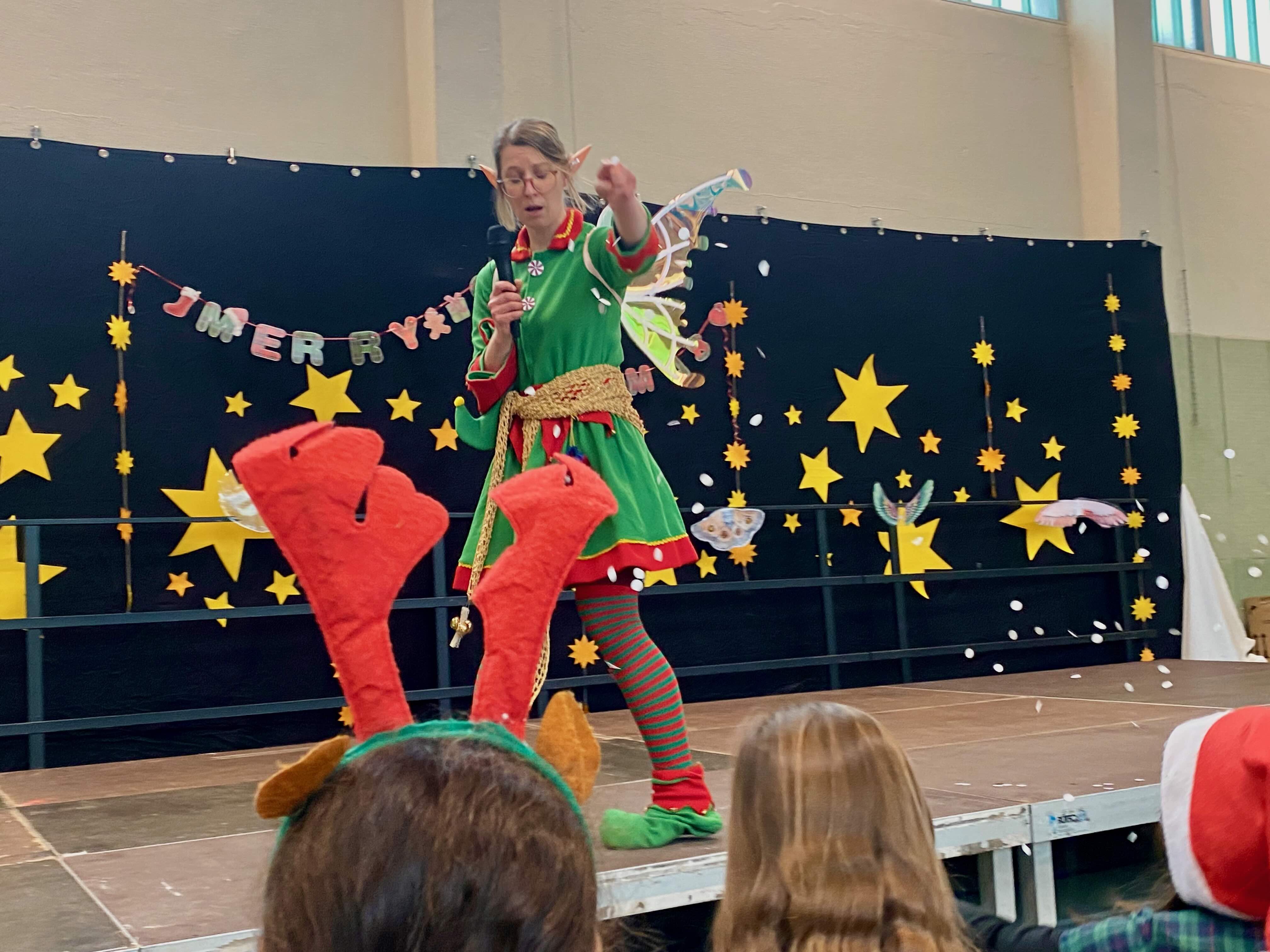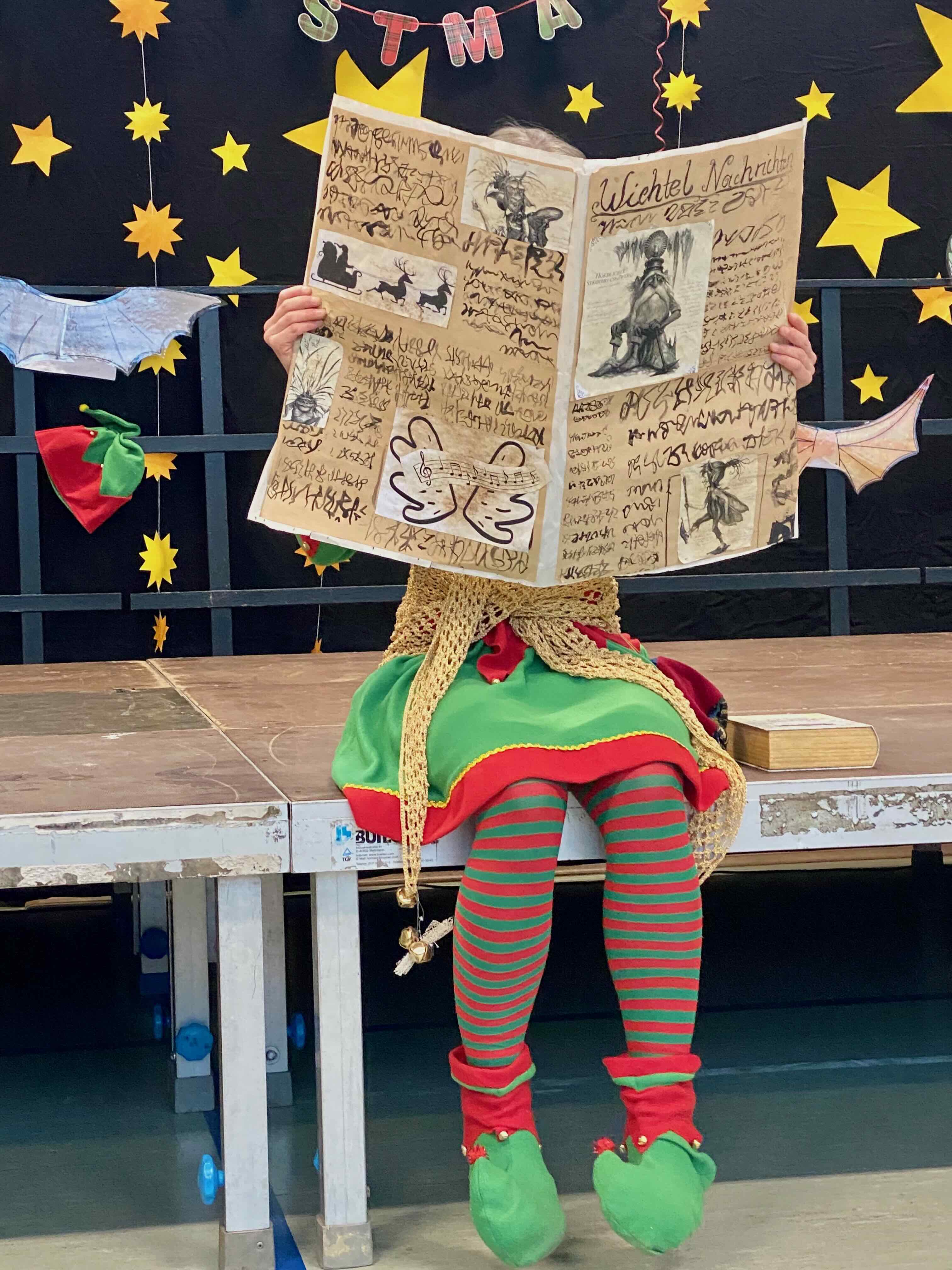 Musikalische Beiträge, Tänze und akrobatische Darstellungen wechselten sich ab und machten die Feier lebendig. Durch das Programm führte charmant ein Weihnachtswichtel, der auf der Suche nach den richtigen Flügeln war, um rechtzeitig mit dem Rentierschlitten zum Nordpol zu fahren. Seine humorvollen Moderationen verbanden die einzelnen Programmpunkte und sorgten immer wieder für ein fröhliches Lachen. Mithilfe der Kinder gelang es ihm, schließlich die richtigen Flügel zu finden.