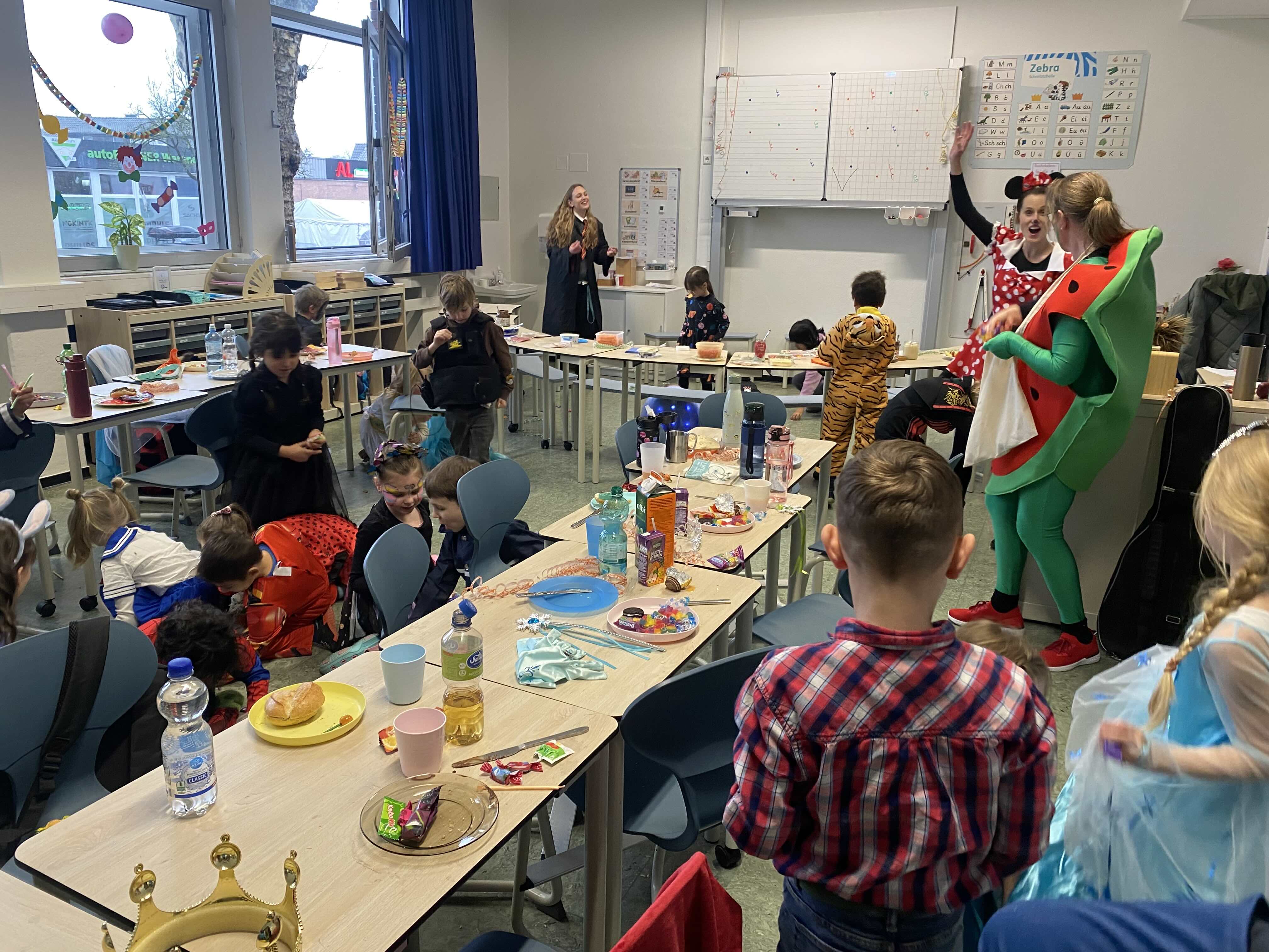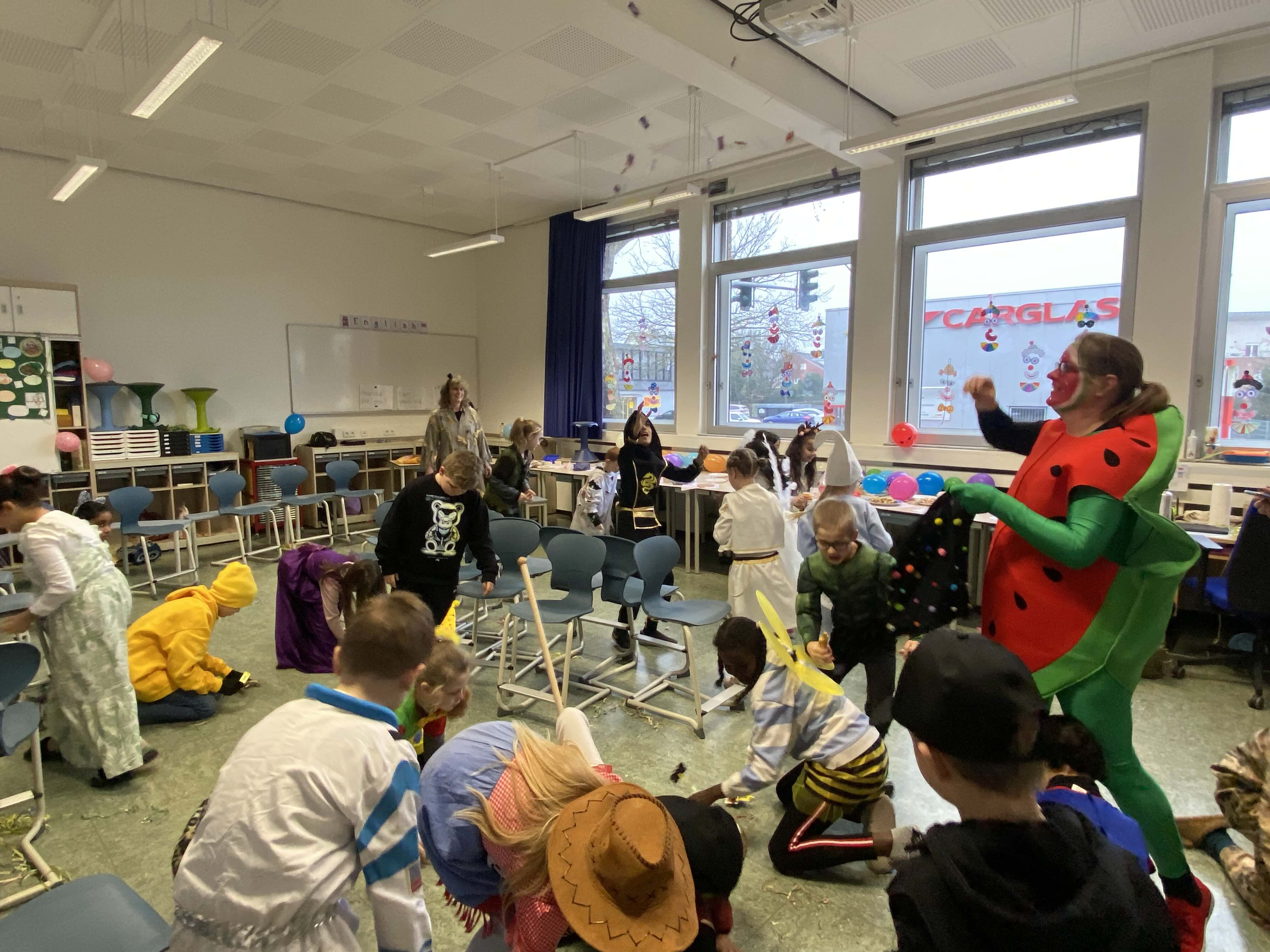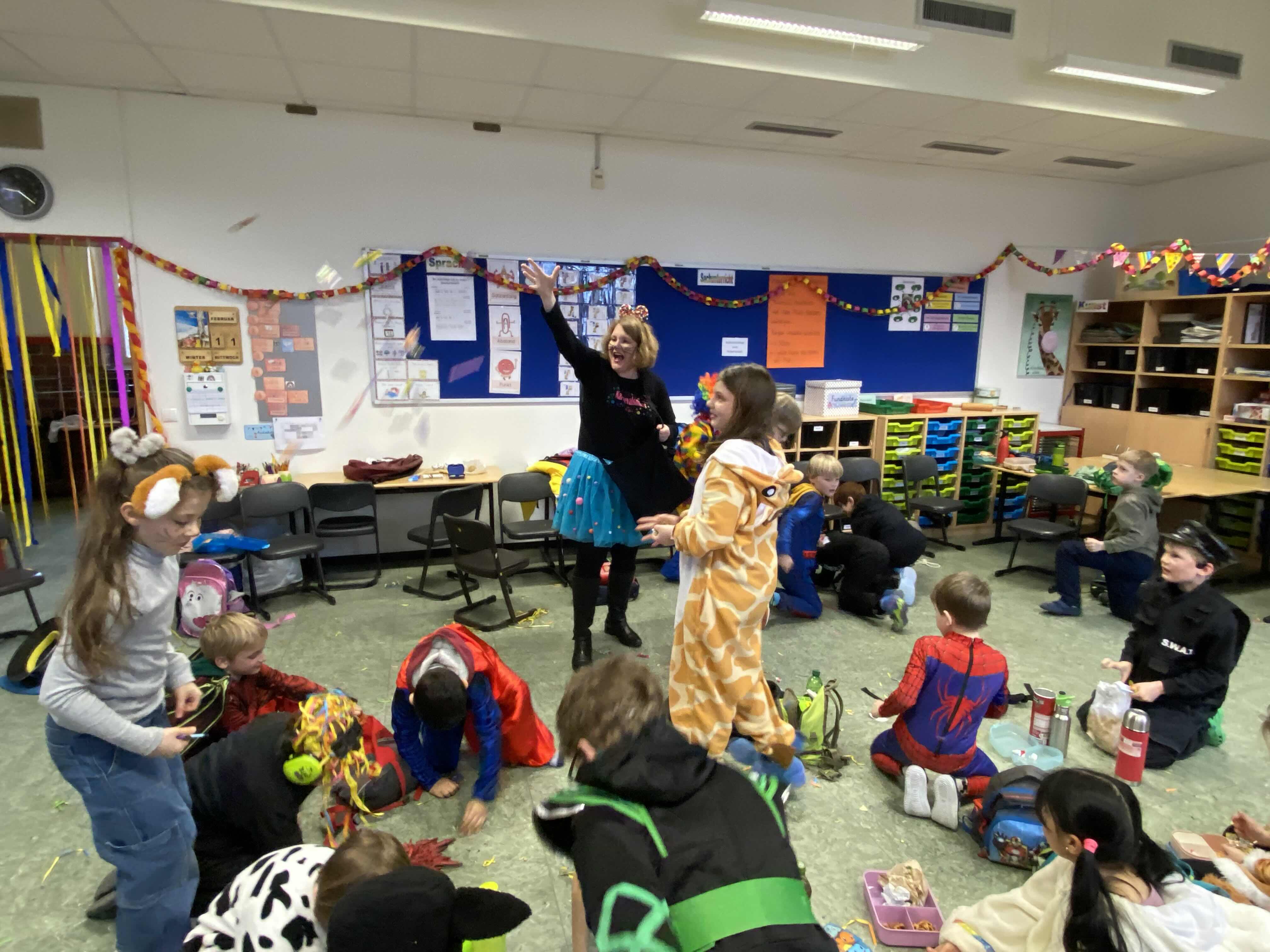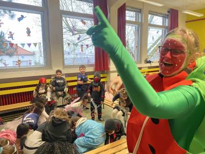 Närrische, tolle Stimmung herrschte am Weiberfastnachtstag und ließ die Overbergschule zur Narrenhochburg werden. Prinzessinnen, Hexen, Piraten, Superhelden, Clowns und weitere verkleidete Narren in farbenfrohen Kostümen konnten in dieser Fünften Jahreszeit bestaunt werden. In den Klassen wurden Karnevalsbüffets zum Frühstück aufgebaut, die dann gemeinsam verspeist wurden. Die Kinder hatten aber auch jede Menge Spaß an den klassischen Spielen wie der Reise nach Jerusalem, der Dirigent, dem Menschenmemory, dem Stopptanz, ... und bewegten sich ausgiebig zu diversen Karnevaldiscohits. Auch traditionelle Kamelle durften nicht fehlen: Frau Licht und Frau Sander gingen durch alle Klassen und blickten beim Streuen der Süßwaren in strahlende, oftmals auch noch geschminkte Gesichter. Aufgrund des Regenwetters konnte der traditionelle Lindwurm durch die Innenstadt nicht stattfinden. Alternativ tobten sich die Kinder bei Partymusik in der Turnhalle aus. Nach der 4. Stunde wurde dann in der Betreuung noch kräftig weiter gefeiert.