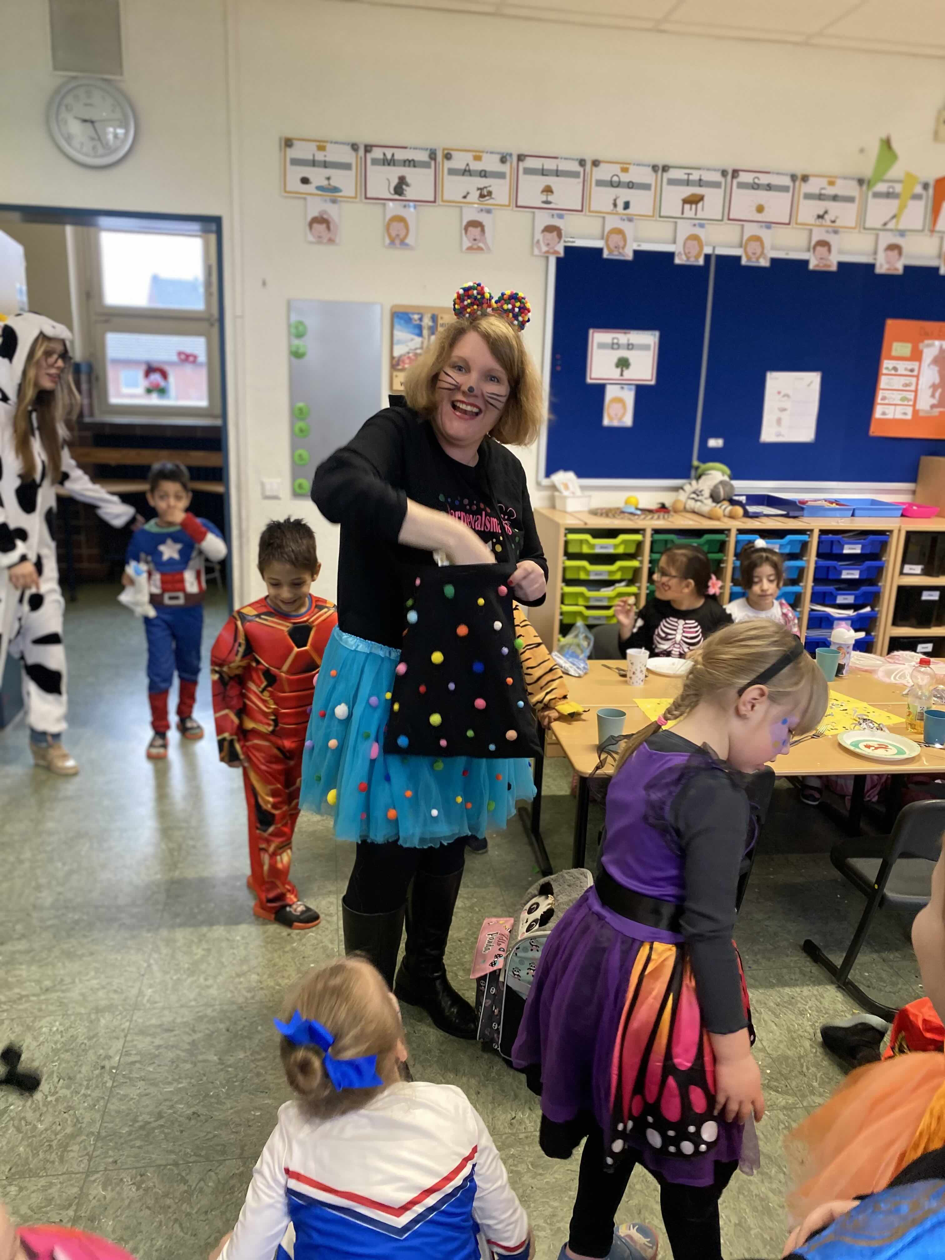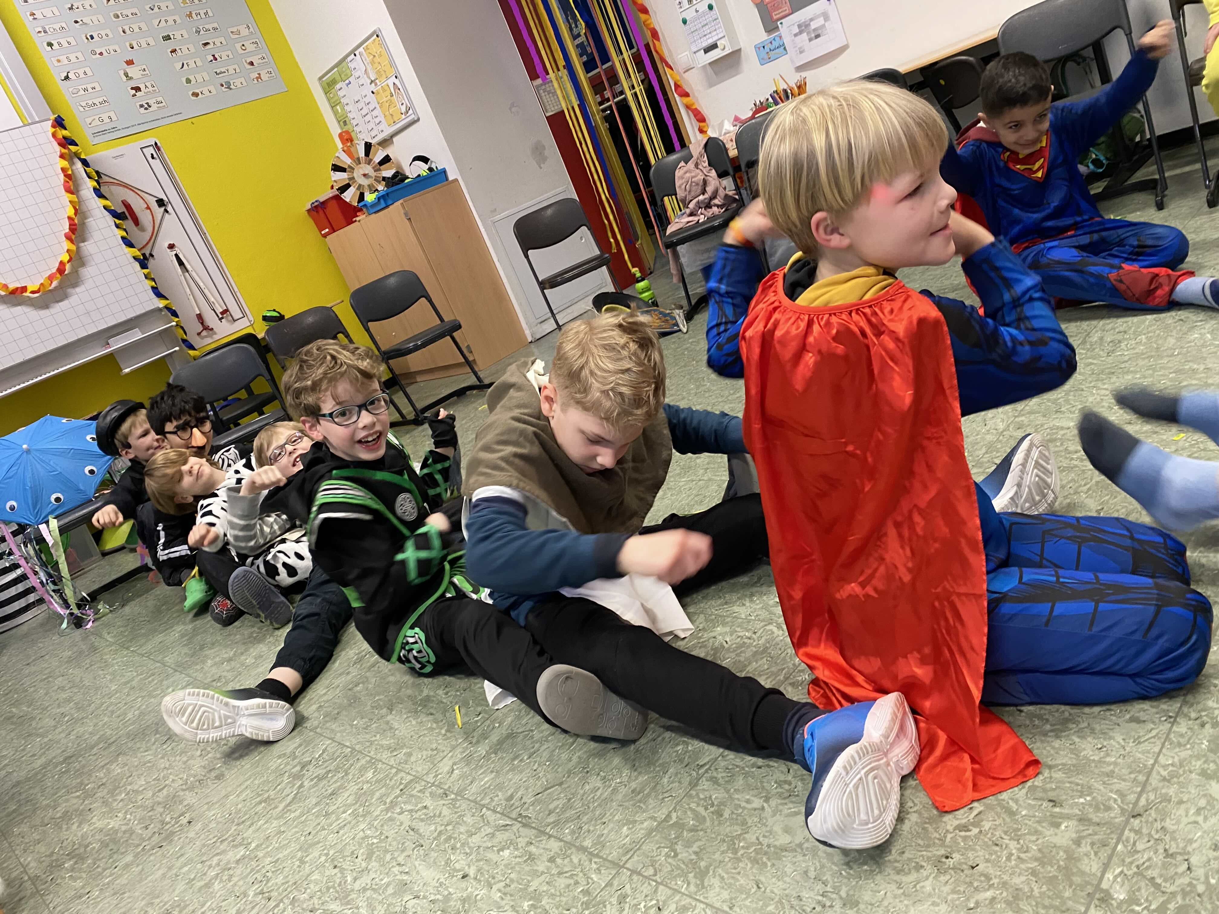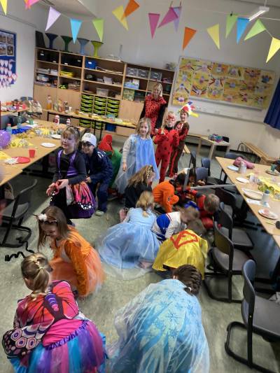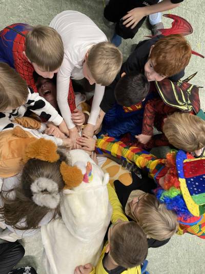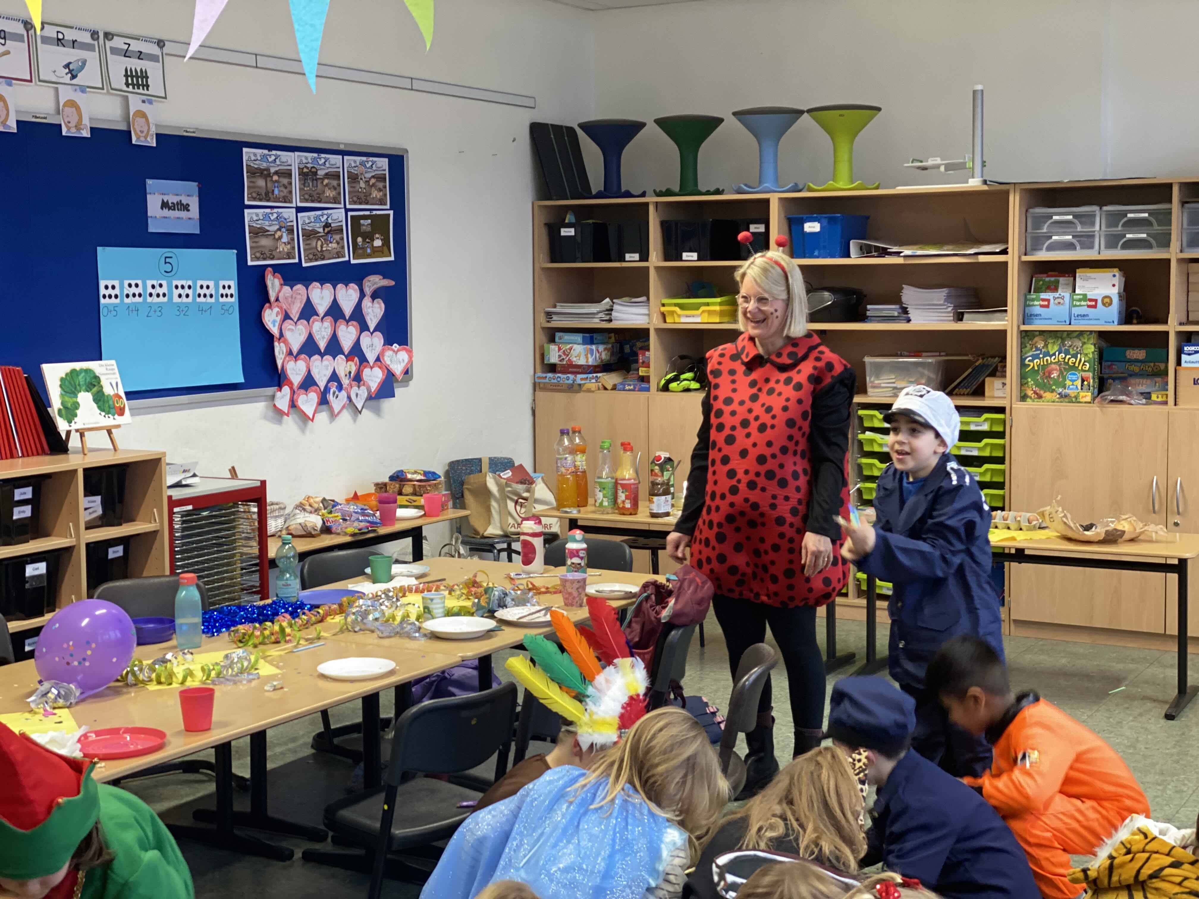 Närrische, tolle Stimmung herrschte am Weiberfastnachtstag und ließ die Overbergschule zur Narrenhochburg werden. Prinzessinnen, Hexen, Piraten, Superhelden, Clowns und weitere verkleidete Narren in farbenfrohen Kostümen konnten in dieser Fünften Jahreszeit bestaunt werden. In den Klassen wurden Karnevalsbüffets zum Frühstück aufgebaut, die dann gemeinsam verspeist wurden. Die Kinder hatten aber auch jede Menge Spaß an den klassischen Spielen wie der Reise nach Jerusalem, der Dirigent, dem Menschenmemory, dem Stopptanz, ... und bewegten sich ausgiebig zu diversen Karnevaldiscohits. Auch traditionelle Kamelle durften nicht fehlen: Frau Licht und Frau Sander gingen durch alle Klassen und blickten beim Streuen der Süßwaren in strahlende, oftmals auch noch geschminkte Gesichter. Aufgrund des Regenwetters konnte der traditionelle Lindwurm durch die Innenstadt nicht stattfinden. Alternativ tobten sich die Kinder bei Partymusik in der Turnhalle aus. Nach der 4. Stunde wurde dann in der Betreuung noch kräftig weiter gefeiert.
