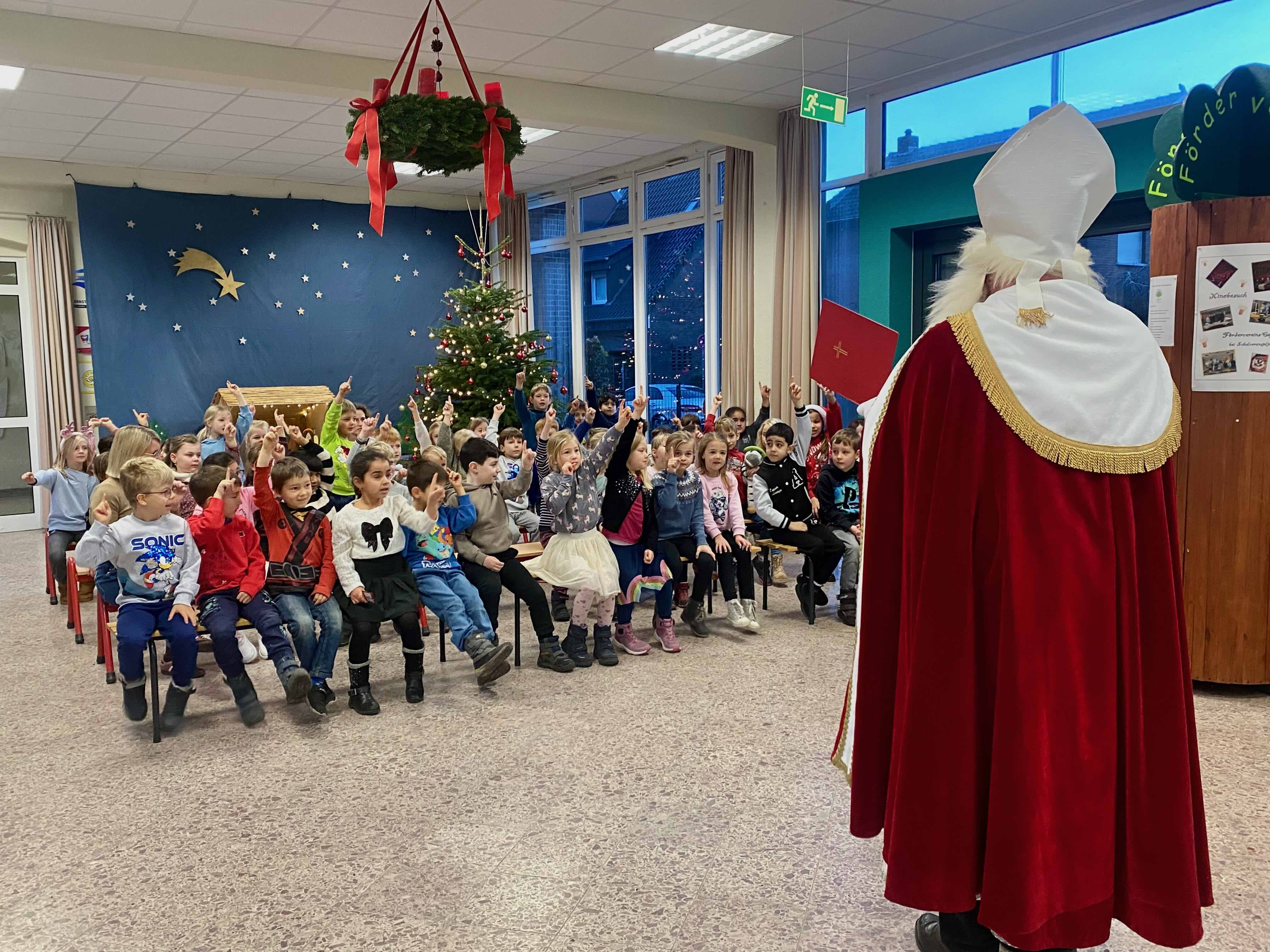 Der Besuch des Nikolaus sorgte für strahlende Gesichter und eine besinnliche Atmosphäre in der Schule, die den Kindern die Geschichte des Nikolaustages näher brachte. Mithilfe der Unterstützung des Fördervereins ist diese Überraschung gelungen.
