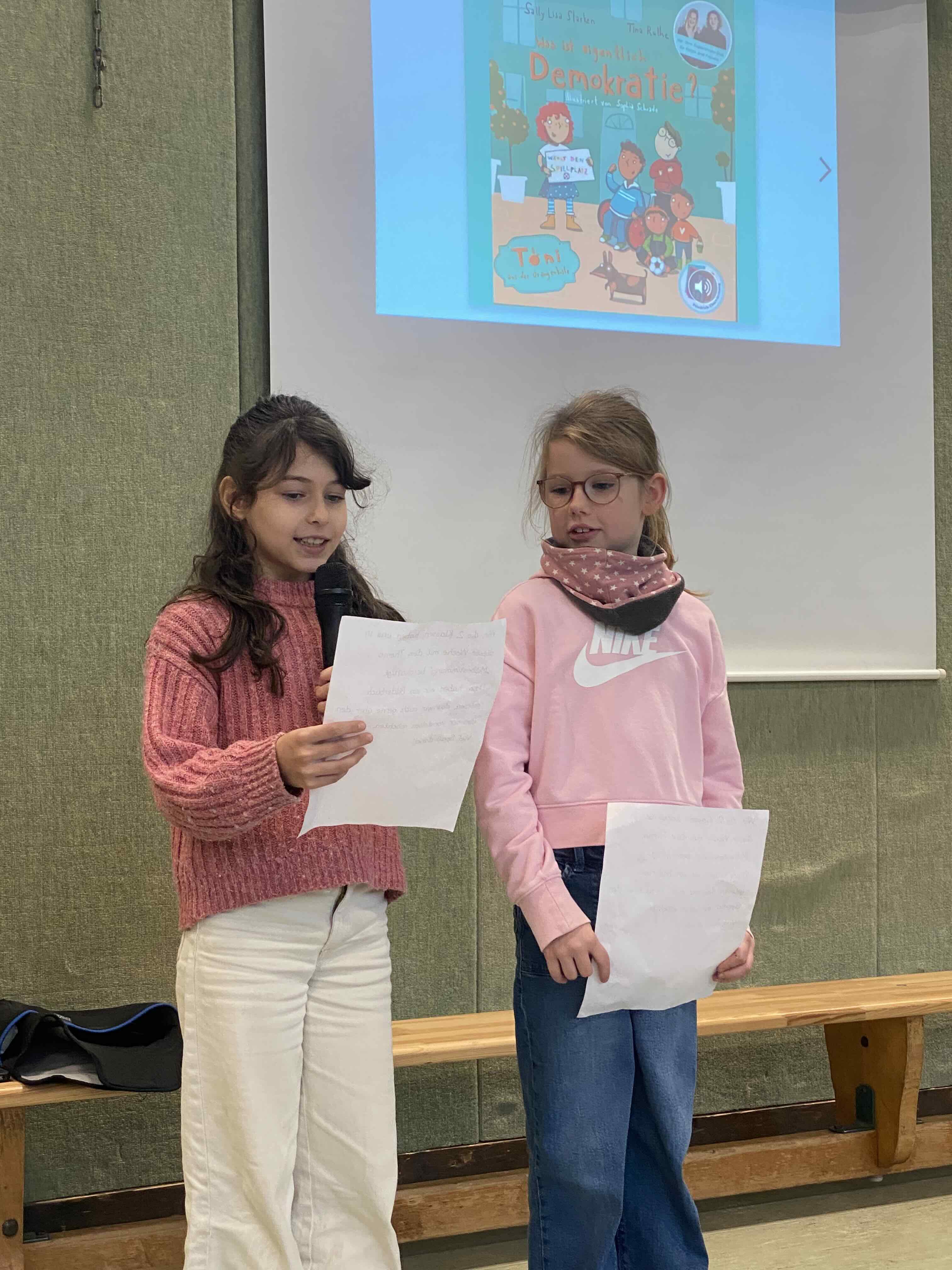 In der Woche vom 03.11. bis 07.11.2025 stand unsere Schule ganz im Zeichen der Demokratie. Unter dem Motto "Mitbestimmen, Mitreden, Mitgestalten" erlebten alle SchülerInnen täglich zwei Unterrichtsstunden, was es bedeutet, Verantwortung zu übernehmen und gemeinsam Entscheidungen zu treffen. Alle Klassen beschäftigten sich dabei mit spannenden Fragen: Wie können wir gut miteinander leben? Wie funktioniert Mitbestimmung in der Schule, in der Klasse oder sogar in der Stadt? Wie läuft eine Wahl ab? In den Klassen wurde dazu gelesen, gespielt und diskutiert. Und unsere ViertklässlerInnen interviewten unseren Bürgermeister Peter Horstmann im Ratssaal des historischen Rathaus. Es entstanden Plakate, Wahlplakate, digitale Bücher und Videos.